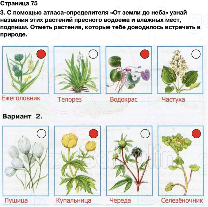 3. С помощью атласа-определителя «От земли до неба» узнай названия этих растений пресного водоема и влажных мест, подпиши. Отметь растения, которые тебе доводилось встречать в природе.