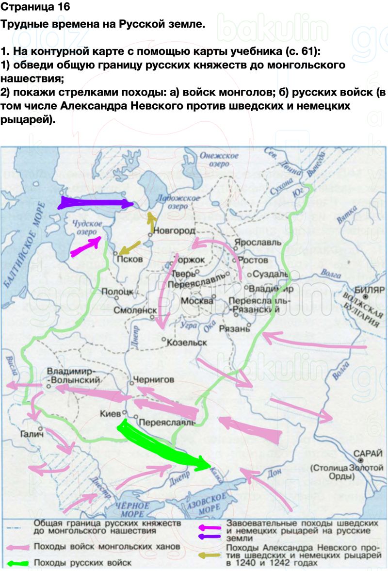 2) покажи стрелками походы: а) войск монголов; б) русских войск (в том числе Александра Невского против шведских и немецких рыцарей).