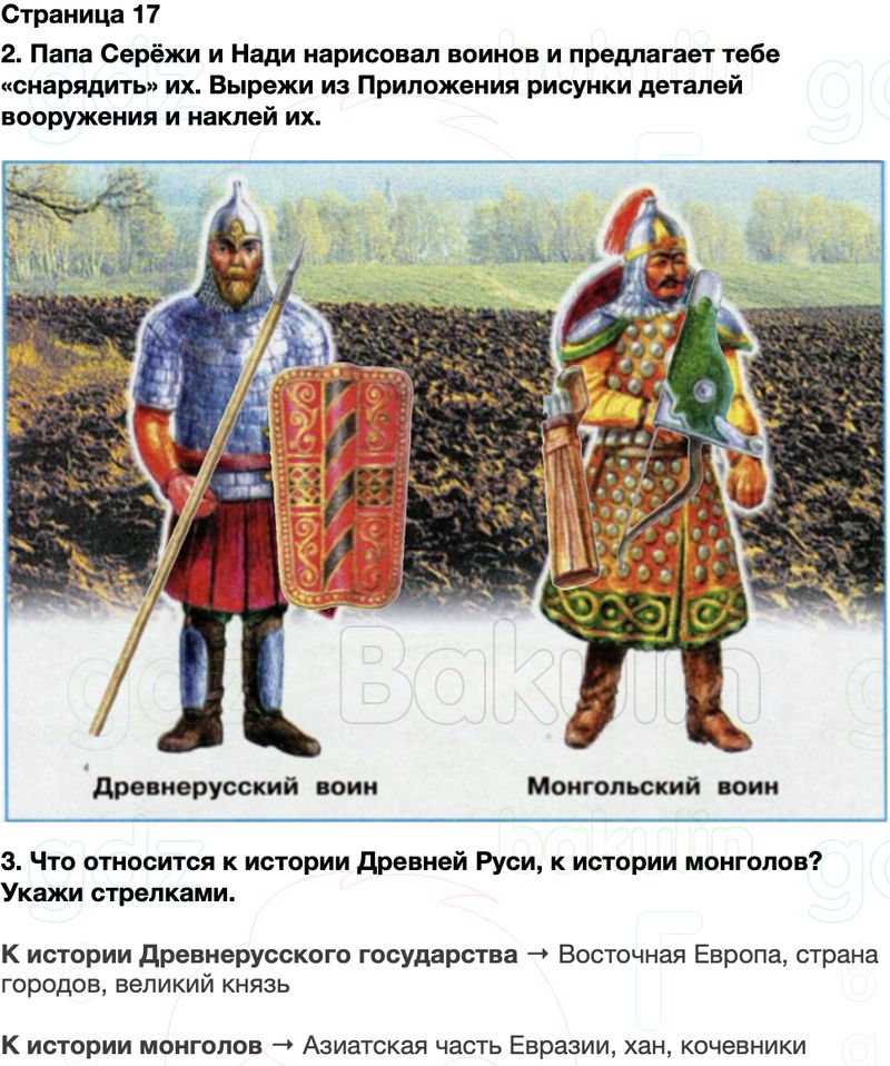 2. Папа Серёжи и Нади нарисовал воинов и предлагает тебе «снарядить» их. Вырежи из Приложения рисунки деталей вооружения и наклей их.