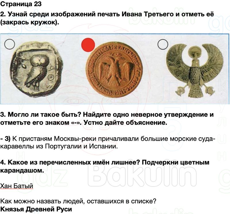 2. Узнай среди изображений печать Ивана Третьего и отметь её (закрась кружок).