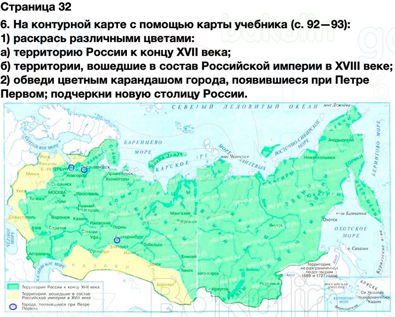 2) обведи цветным карандашом города, появившиеся при Петре Первом; подчеркни новую столицу России.