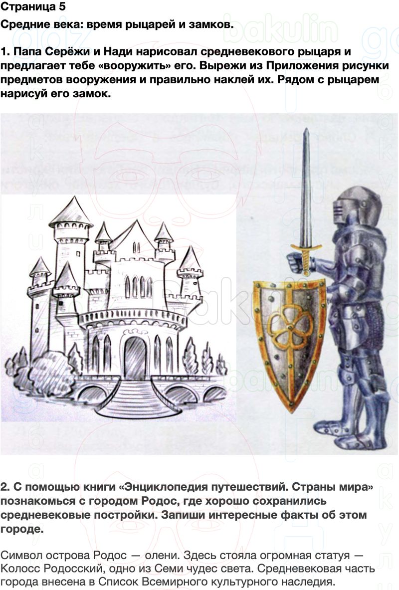 2. Вырежи из Приложения рисунки предметов вооружения и правильно наклей их. Рядом с рыцарем нарисуй его замок.