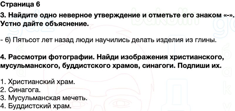 4. Рассмотри фотографии. Найди изображения христианского, мусульманского, буддистского храмов, синагоги. Подпиши их.