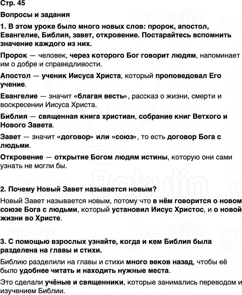 1. В этом уроке было много новых слов: пророк, апостол, Евангелие, Библия, завет, откровение. Постарайтесь вспомнить значение каждого из них.