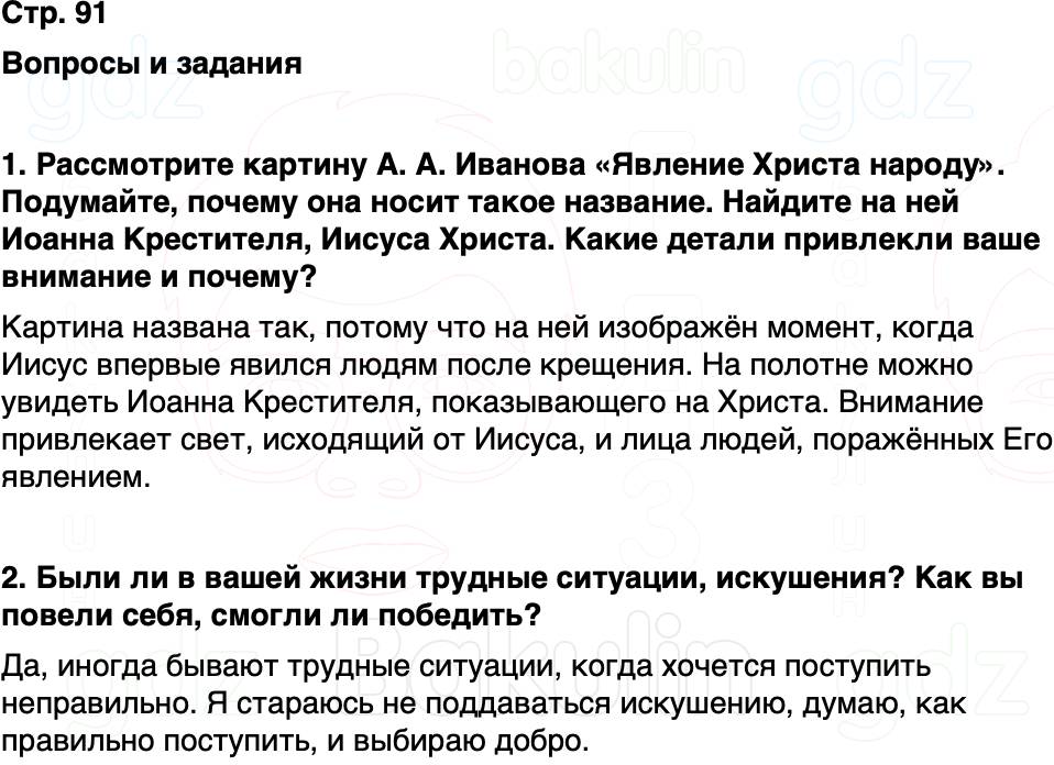 1. Рассмотрите картину А. А. Иванова «Явление Христа народу». Подумайте, почему она носит такое название. Найдите на ней Иоанна Крестителя, Иисуса Христа. Какие детали привлекли ваше внимание и почему?