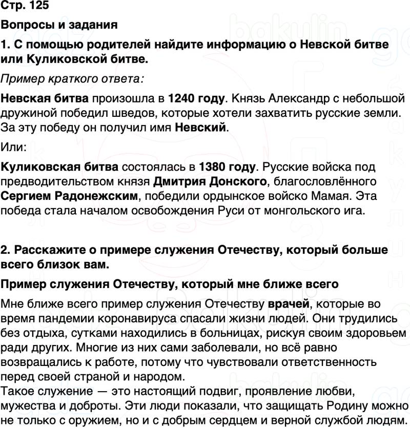 Стр. 125 Вопросы и задания 1. С помощью родителей найдите информацию о Невской битве или Куликовской битве.