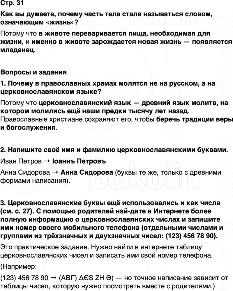 3. Церковнославянские буквы ещё использовались и как числа (см. с. 27). С помощью родителей най-дите в Интернете более полную информацию о церковнославянских числах и запишите ими номер своего мобильного телефона (отдельными числами и группами из трёхзначных и двухзначных чисел: (123) 456 78 90).