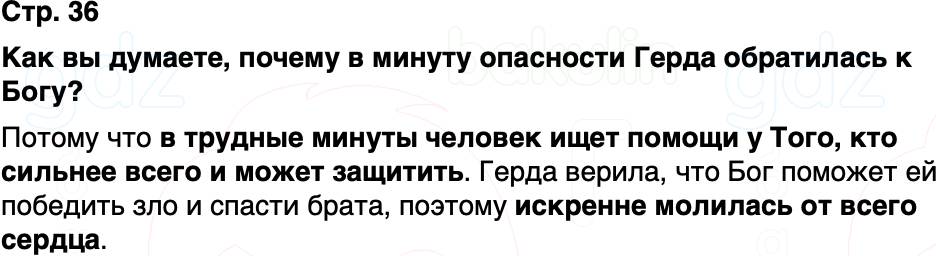 Стр. 36 Как вы думаете, почему в минуту опасности Герда обратилась к Богу?