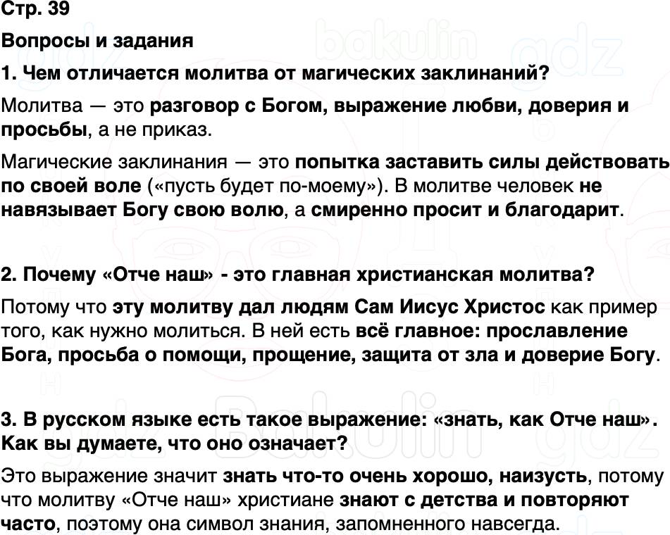 Вопросы и задания 1. Чем отличается молитва от магических заклинаний? 2. Почему «Отче наш» - это главная христианская молитва? 3. В русском языке есть такое выражение: «знать, как Отче наш». Как вы думаете, что оно означает?