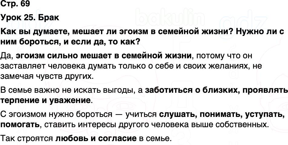 Стр. 69 Урок 25. Брак Как вы думаете, мешает ли эгоизм в семейной жизни? Нужно ли с ним бороться, и если да, то как?