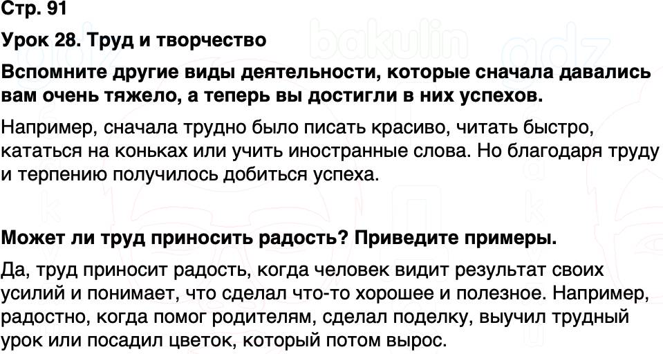 Стр. 91 Урок 28. Труд и творчество Вспомните другие виды деятельности, которые сначала давались вам очень тяжело, а теперь вы достигли в них успехов.