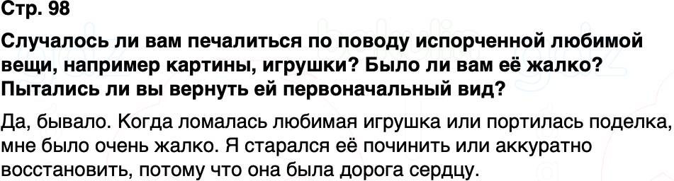 Стр. 98 Случалось ли вам печалиться по поводу испорченной любимой вещи, например картины, игрушки? Было ли вам её жалко? Пытались ли вы вернуть ей первоначальный вид?