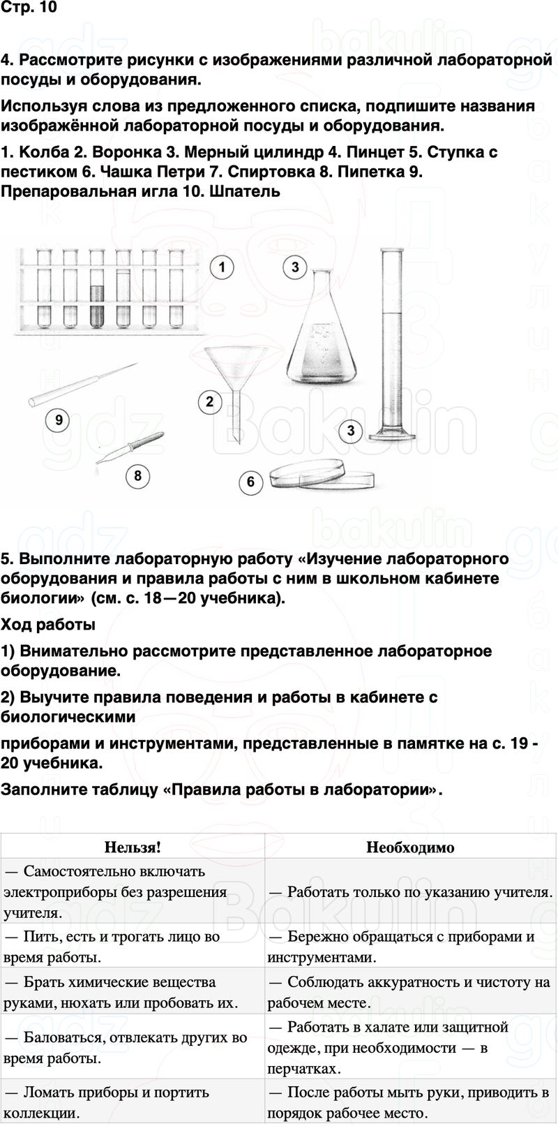 5. Выполните лабораторную работу «Изучение лабораторного оборудования и правила работы с ним в школьном кабинете биологии» (см. с. 18—20 учебника).
