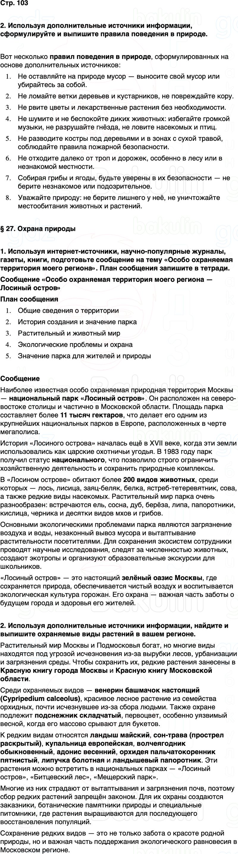 1. Используя интернет-источники, научно-популярные журналы, газеты, книги, подготовьте сообщение на тему «Особо охраняемая территория моего региона». План сообщения запишите в тетради.