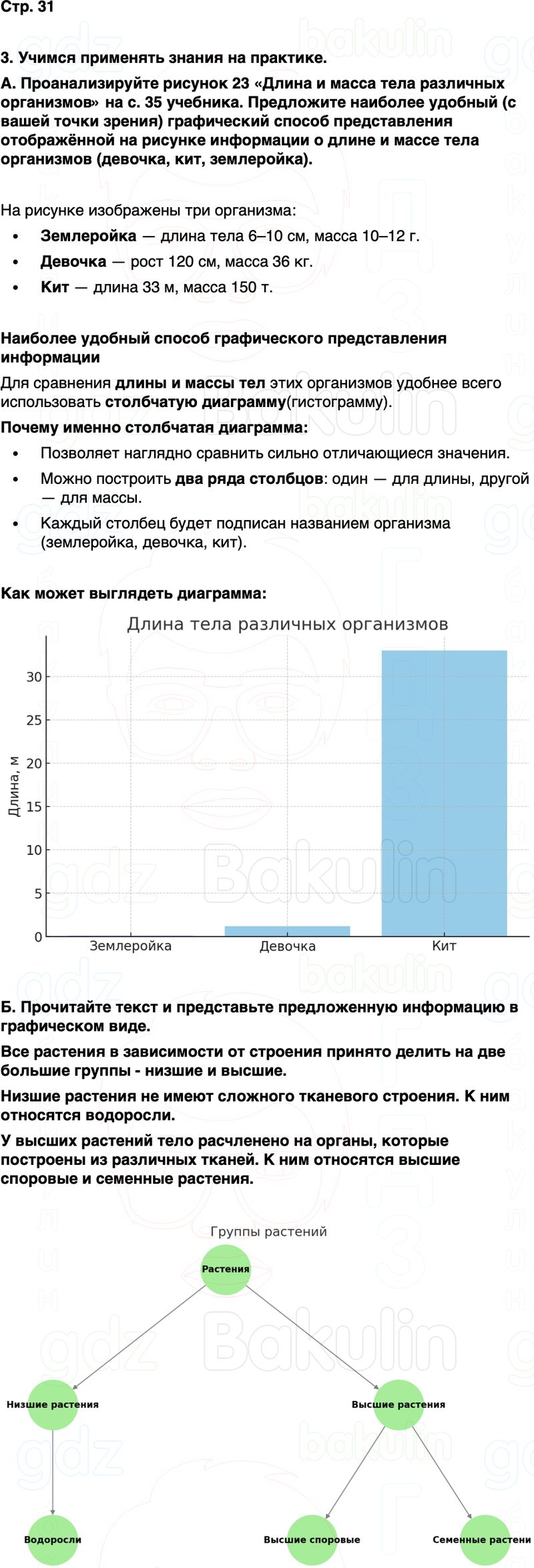 А. Проанализируйте рисунок 23 «Длина и масса тела различных организмов» на с. 35 учебника. Предложите наиболее удобный (с вашей точки зрения) графический способ представления отображённой на рисунке информации о длине и массе тела организмов (девочка, кит, землеройка).