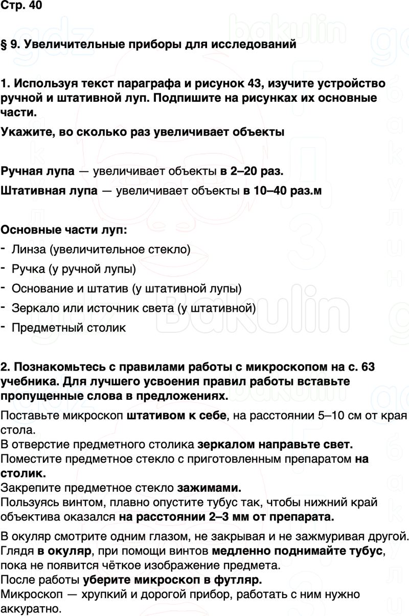 1. Используя текст параграфа и рисунок 43, изучите устройство ручной и штативной луп. Подпишите на рисунках их основные части.