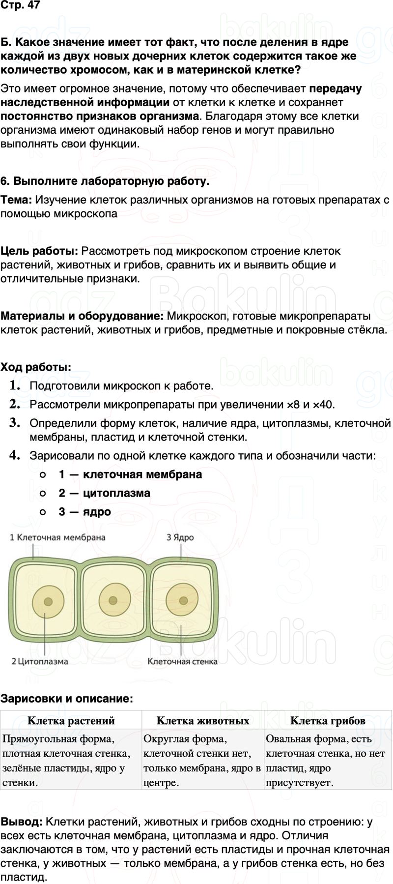 2) Рассмотрите предложенные микропрепараты при малом х8, а затем при большом увеличении микроскопа. Отметьте, какую форму имеют клетки. Выясните, имеют ли клетки ядро, пластиды и клеточную стенку.