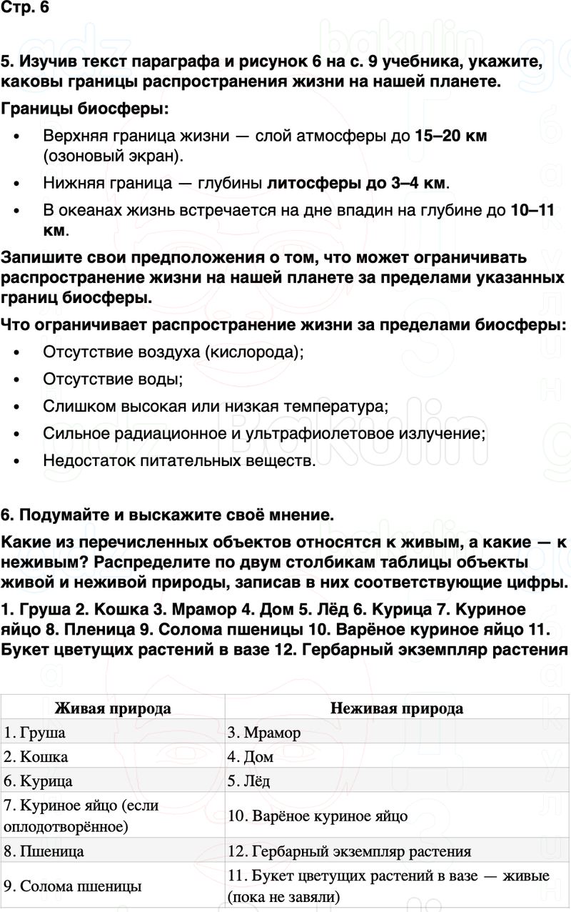 5. Изучив текст параграфа и рисунок 6 на с. 9 учебника, укажите, каковы границы распространения жизни на нашей планете. Запишите свои предположения о том, что может ограничивать распространение жизни на нашей планете за пределами указанных границ биосферы.