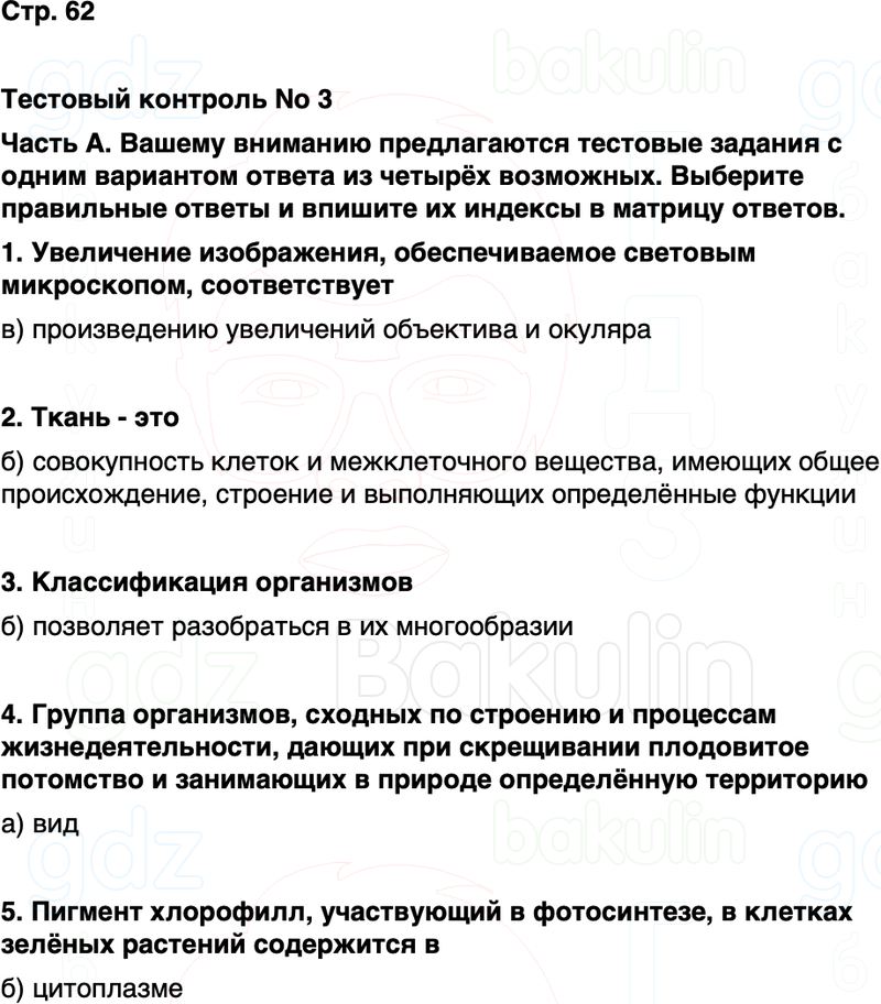 5. Пигмент хлорофилл, участвующий в фотосинтезе, в клетках зелёных растений содержится в а) ядре в) хлоропластах б) цитоплазме г) вакуолях