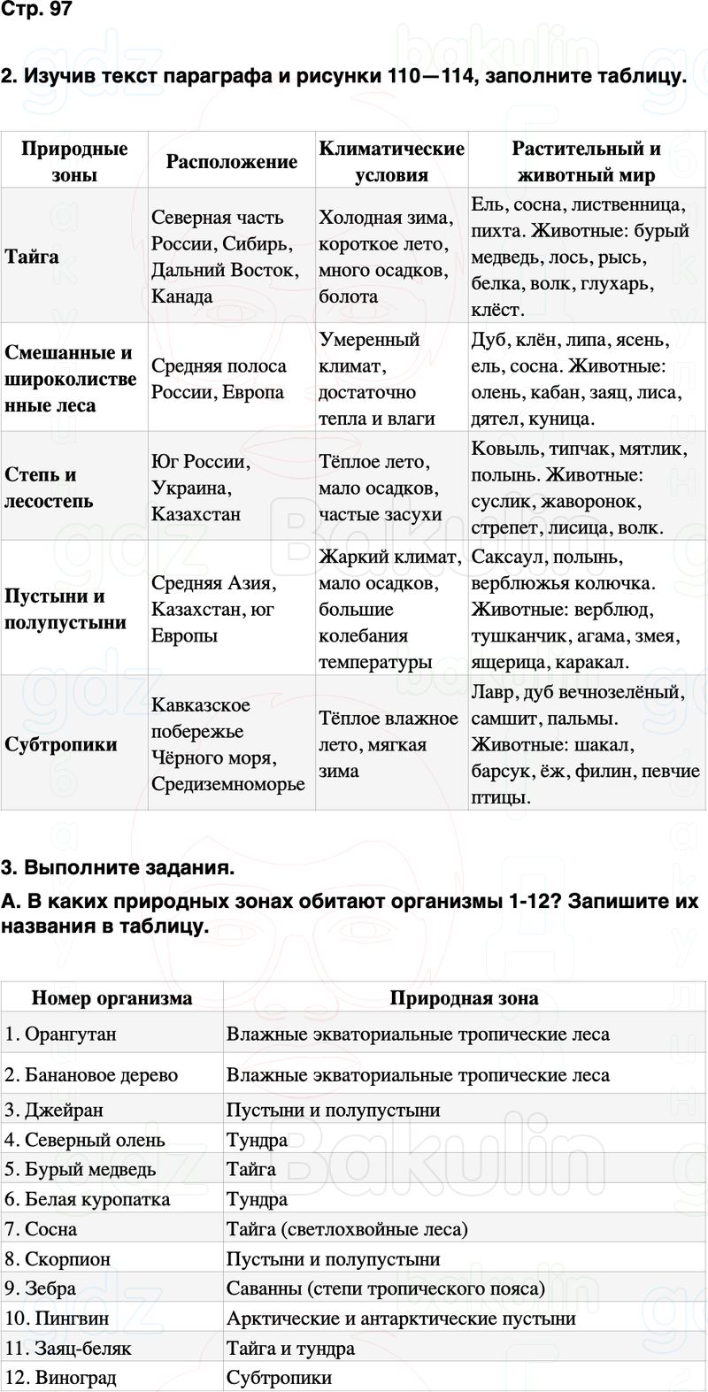 3. Выполните задания. А. Вкаких природных зонах обитают организмы 1-12? Запишите их названия в таблицу.