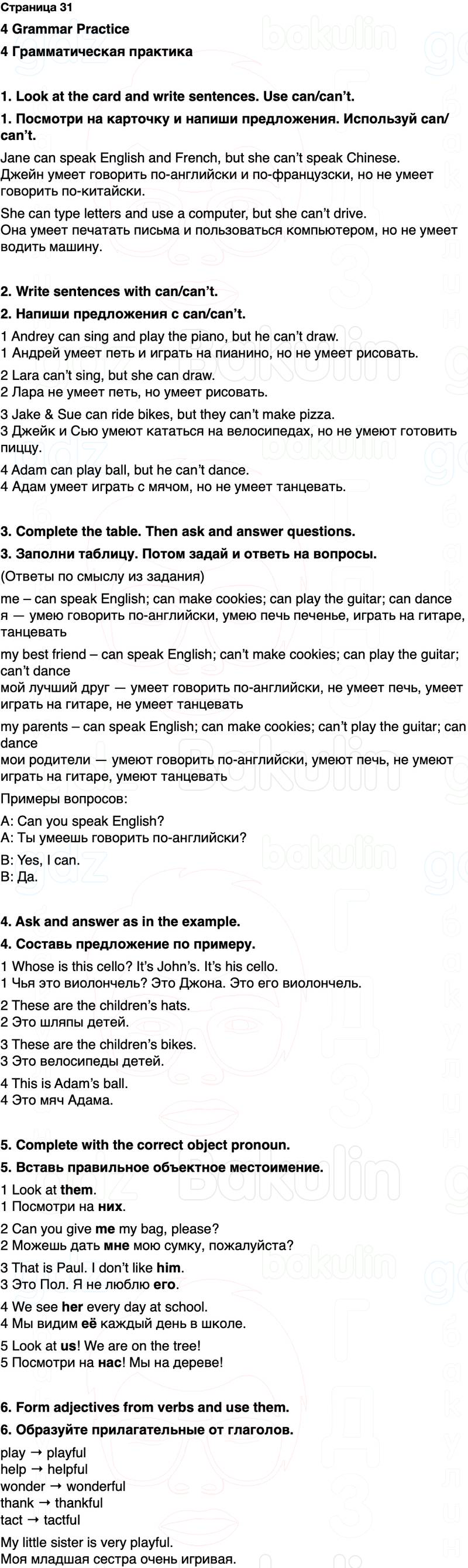 1. Посмотри на карточку и напиши предложения. Используй can/can’t.