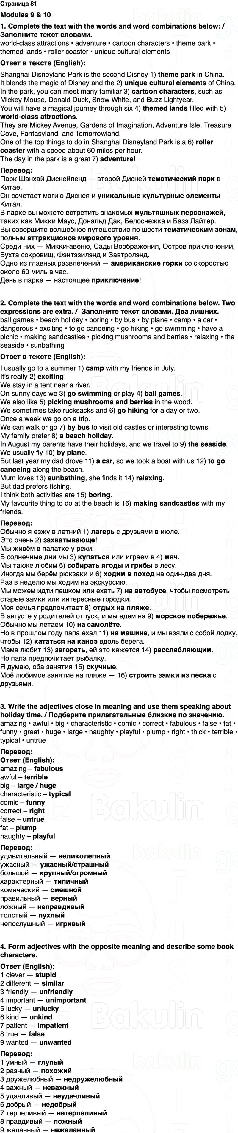 ball games • beach holiday • boring • by bus • by plane • camp • a car • dangerous • exciting • to go canoeing • go hiking • go swimming • have a picnic • making sandcastles • picking mushrooms and berries • relaxing • the seaside • sunbathing