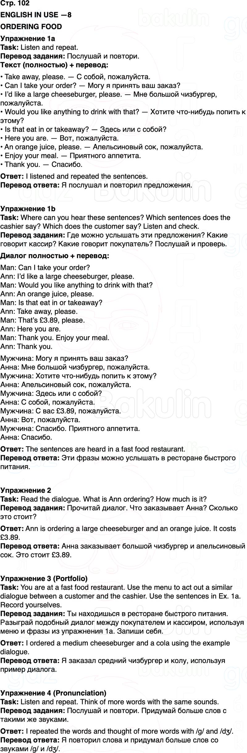 Перевод задания: Ты находишься в ресторане быстрого питания. Разыграй подобный диалог между покупателем и кассиром, используя меню и фразы из упражнения 1a. Запиши себя.