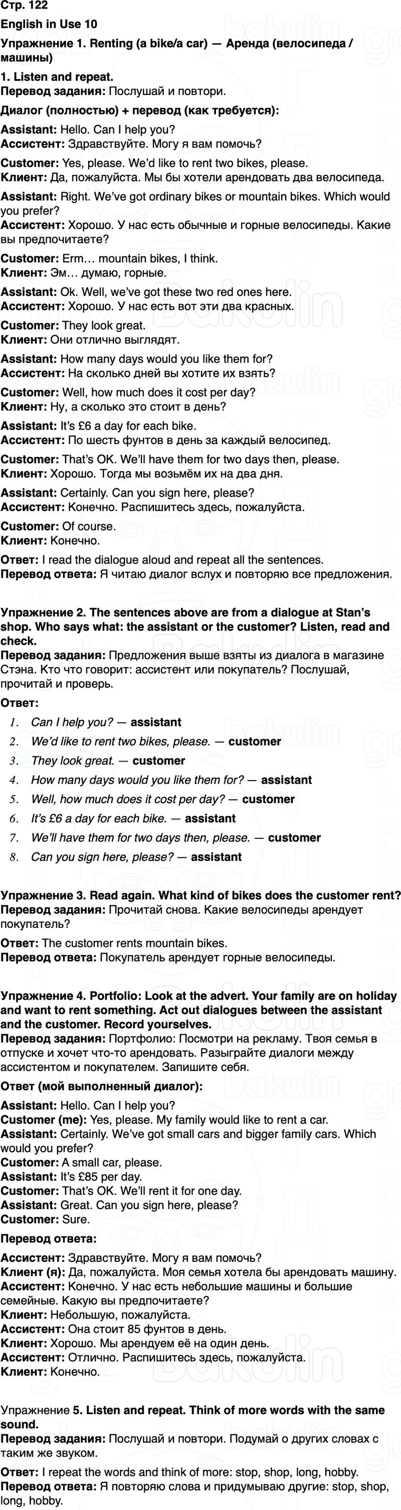 Упражнение 4. Portfolio: Look at the advert. Your family are on holiday and want to rent something. Act out dialogues between the assistant and the customer. Record yourselves.