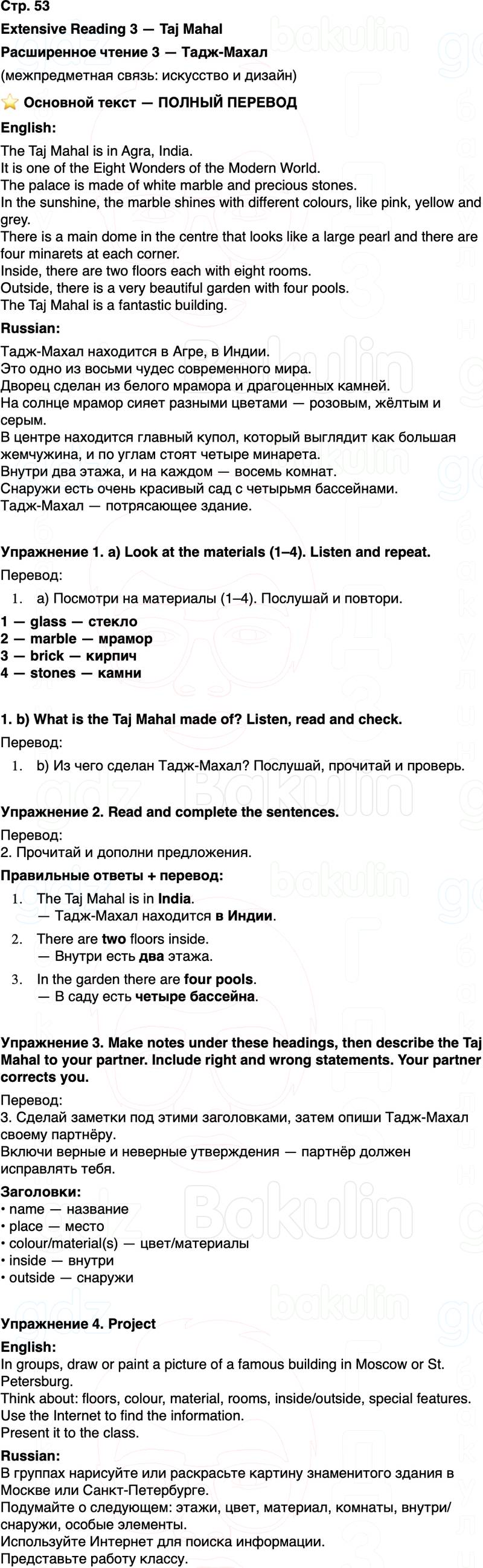 Перевод: b) Из чего сделан Тадж-Махал? Послушай, прочитай и проверь.