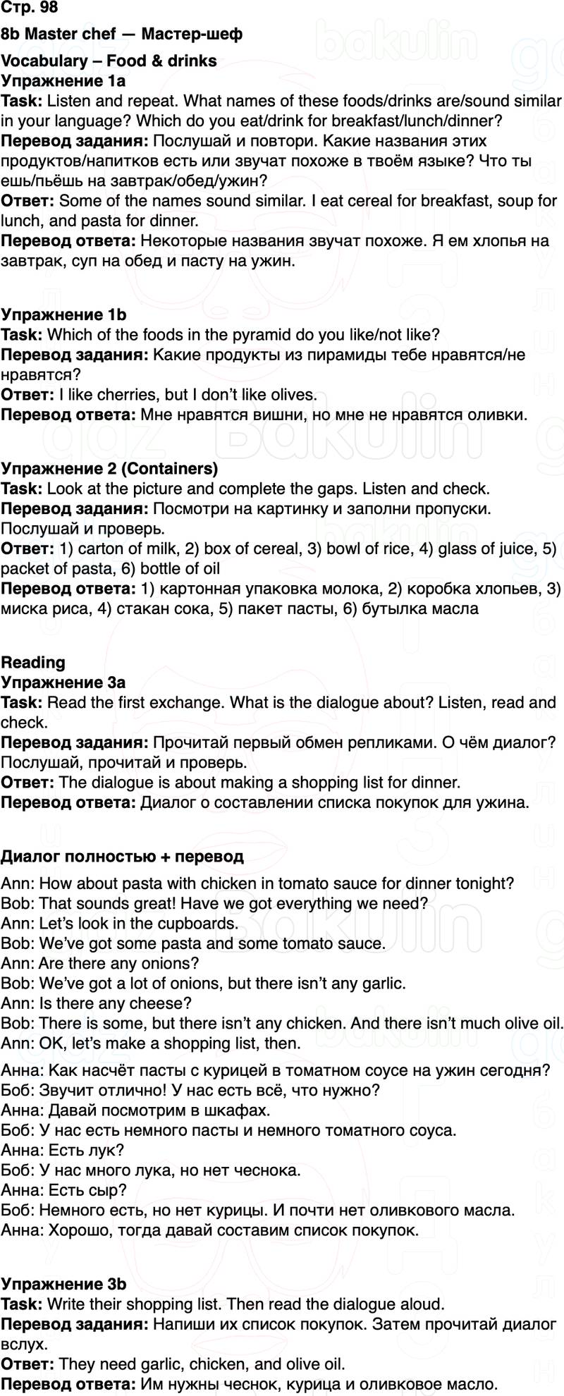 Перевод задания: Послушай и повтори. Какие названия этих продуктов/напитков есть или звучат похоже в твоём языке? Что ты ешь/пьёшь на завтрак/обед/ужин?