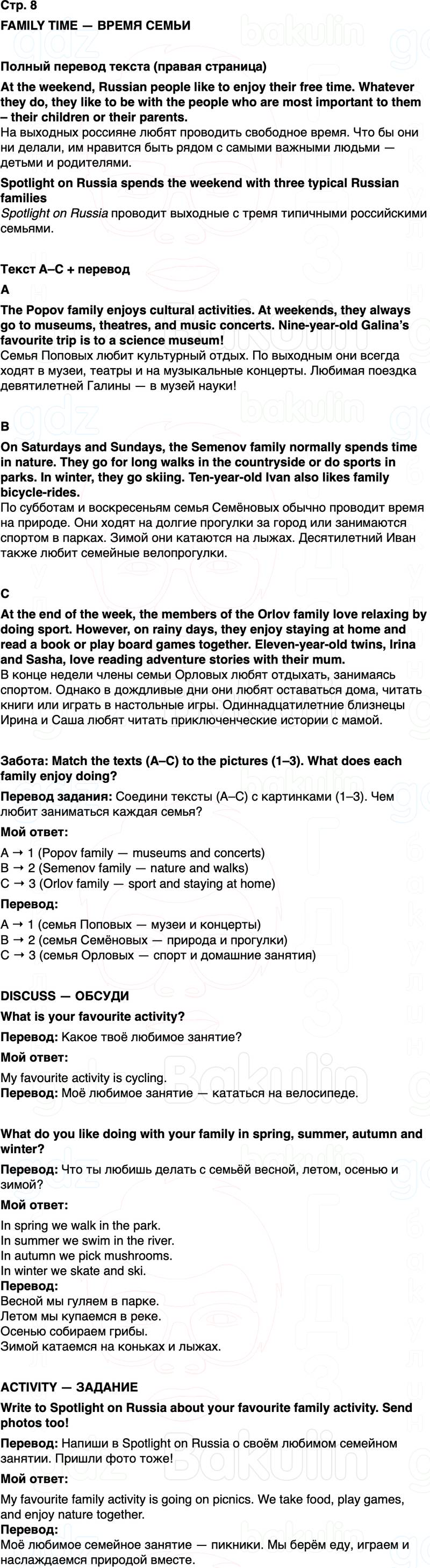 Перевод: Напиши в Spotlight on Russia о своём любимом семейном занятии. Пришли фото тоже!