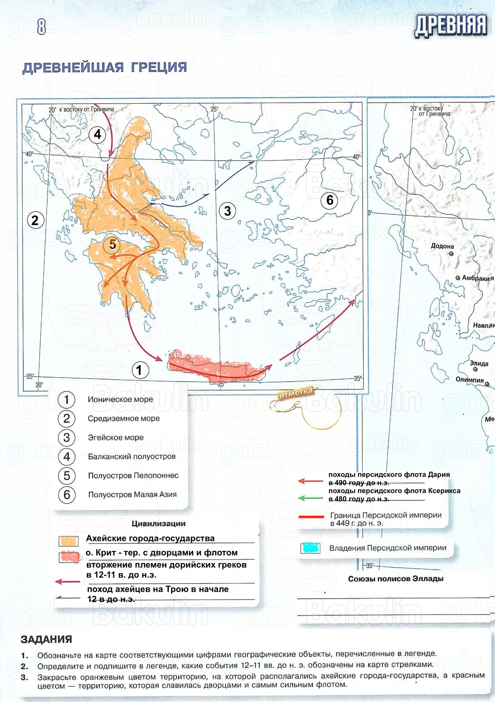 3. Закрасьте оранжевым цветом территорию, на которой располагались ахейские города-государства, а красным цветом — территорию, которая славилась дворцами и самым сильным флотом.