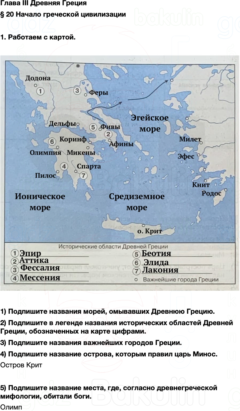 2) Подпишите в легенде названия исторических областей Древней Греции, обозначенных на карте цифрами.