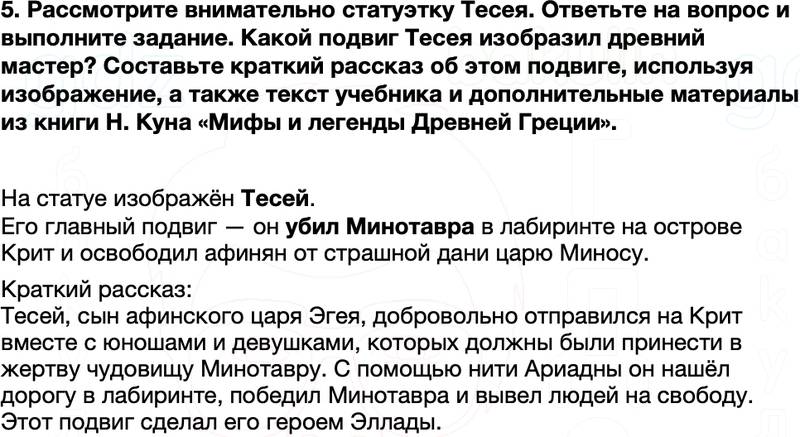 5. Рассмотрите внимательно статуэтку Тесея. Ответьте на вопрос и выполните задание. Какой подвиг Тесея изобразил древний мастер? Составьте краткий рассказ об этом подвиге, используя изображение, а также текст учебника и дополнительные материалы из книги Н. Куна «Мифы и легенды Древней Греции».