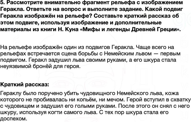 5. Рассмотрите внимательно фрагмент рельефа с изображением Геракла. Ответьте на вопрос и выполните задание. Какой подвиг Геракла изображён на рельефе? Составьте краткий рассказ об этом подвиге, используя изображение и дополнительные материалы из книги Н. Куна «Мифы и легенды Древней Греции».