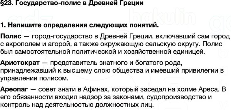 Правильный ответ к заданию из ГДЗ История древнего мира Рабочая тетрадь 5 класс Саплина, Соломатина §23. Государство-полис в Древней Греции, номер 1