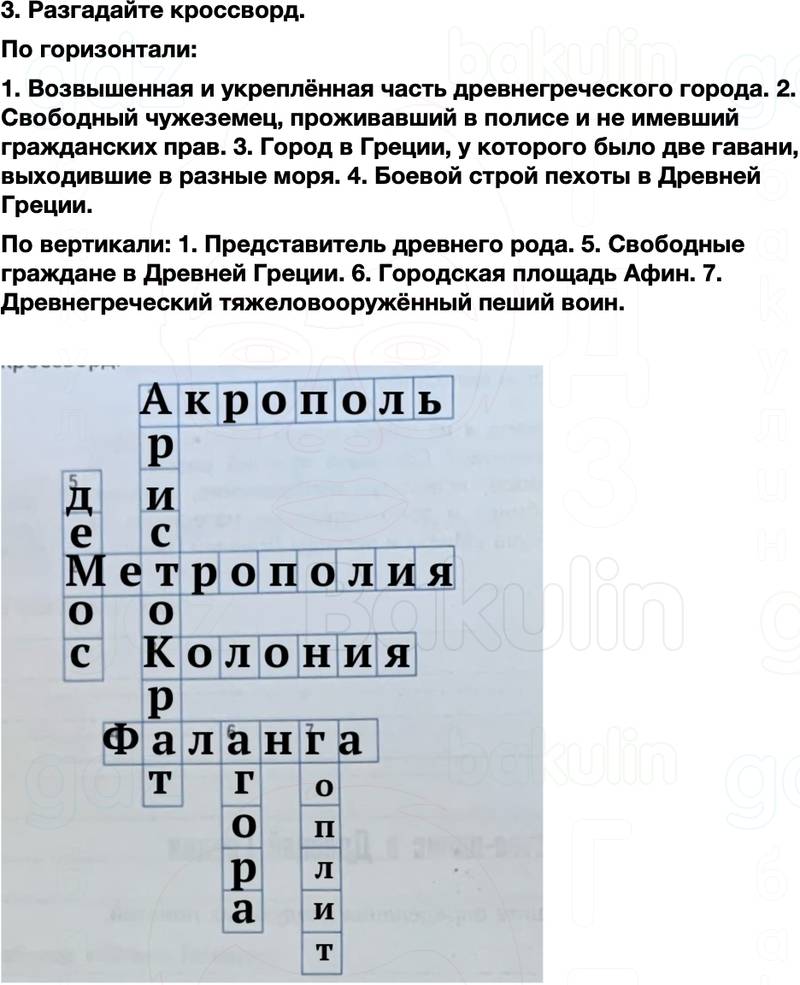 По вертикали: 1. Представитель древнего рода. 5. Свободные граждане в Древней Греции. 6. Городская площадь Афин. 7. Древнегреческий тяжеловооружённый пеший воин.