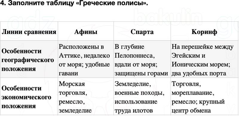 Правильный ответ к заданию из ГДЗ История древнего мира Рабочая тетрадь 5 класс Саплина, Соломатина §23. Государство-полис в Древней Греции, номер 4