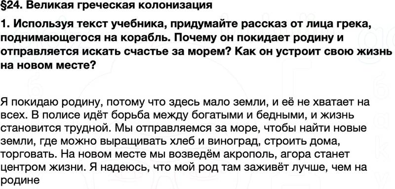 1. Используя текст учебника, придумайте рассказ от лица грека, поднимающегося на корабль. Почему он покидает родину и отправляется искать счастье за морем? Как он устроит свою жизнь на новом месте?