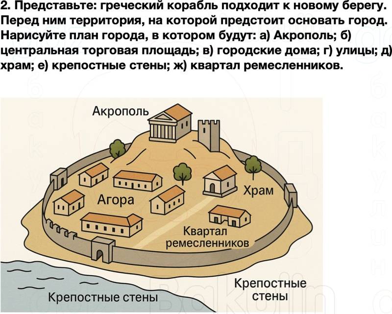 2. Представьте: греческий корабль подходит к новому берегу. Перед ним территория, на которой предстоит основать город. Нарисуйте план города, в котором будут: а) Акрополь; б) центральная торговая площадь; в) городские дома; г) улицы; д) храм; е) крепостные стены; ж) квартал ремесленников.