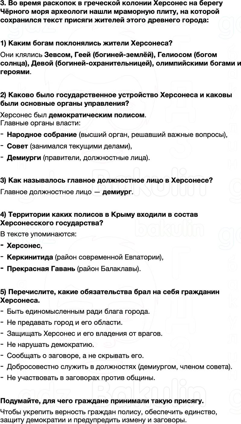 3. Во время раскопок в греческой колонии Херсонес на берегу Чёрного моря археологи нашли мраморную плиту, на которой сохранился текст присяги жителей этого древнего города: