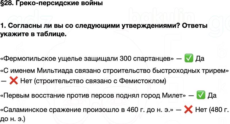 Правильный ответ к заданию из ГДЗ История древнего мира Рабочая тетрадь 5 класс Саплина, Соломатина §28. Греко-персидские войны, номер 1