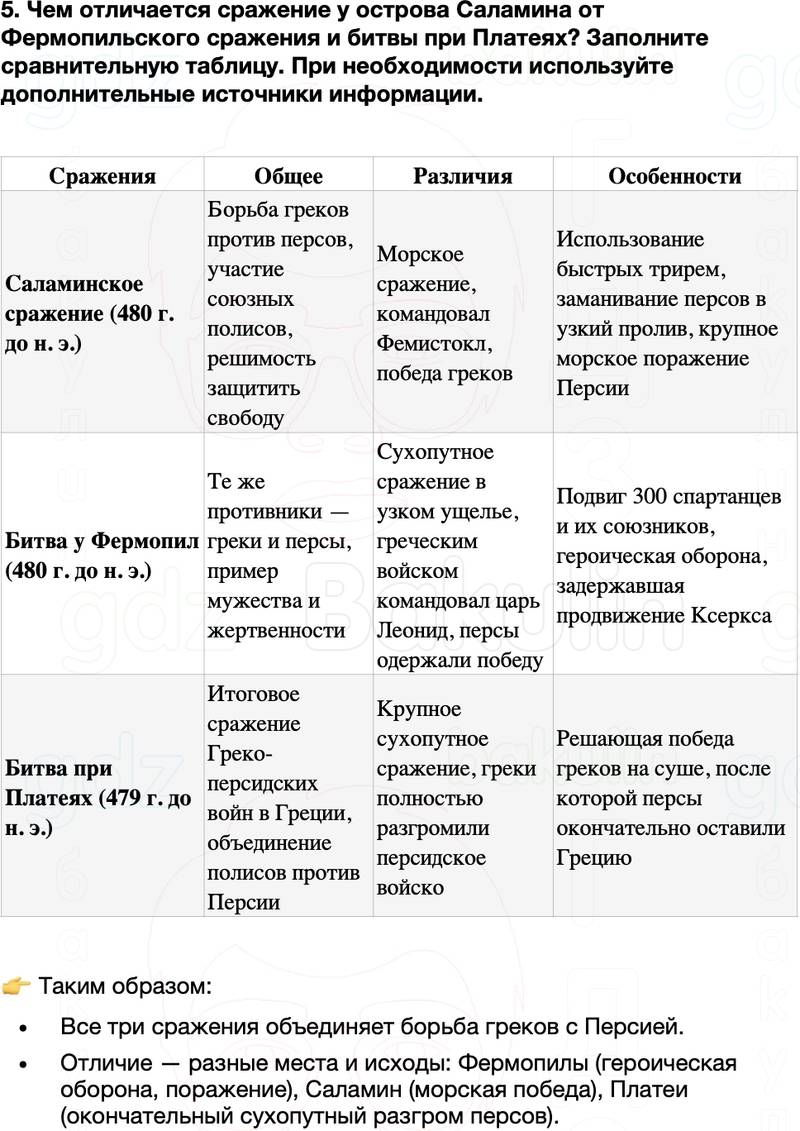 5. Чем отличается сражение у острова Саламина от Фермопильского сражения и битвы при Платеях? Заполните сравнительную таблицу. При необходимости используйте дополнительные источники информации.