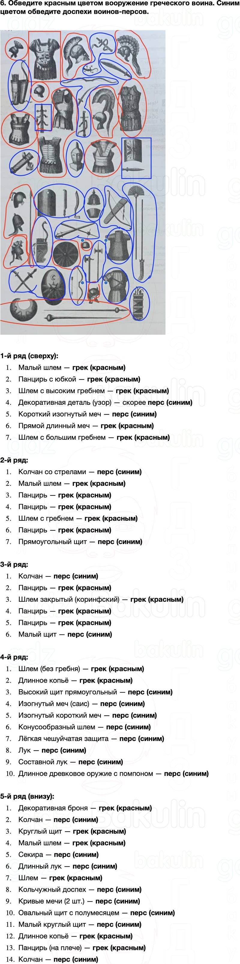 6. Обведите красным цветом вооружение греческого воина. Синим цветом обведите доспехи воинов-персов.