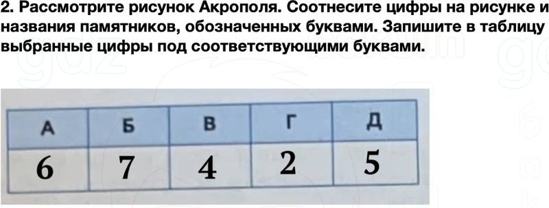 2. Рассмотрите рисунок Акрополя. Соотнесите цифры на рисунке и названия памятников, обозначенных буквами. Запишите в таблицу выбранные цифры под соответствующими буквами.