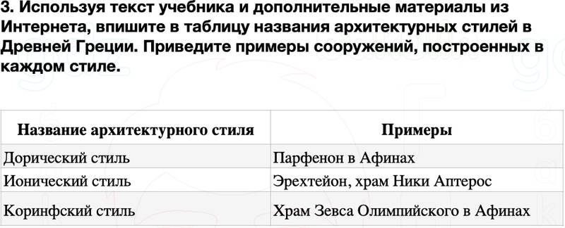 3. Используя текст учебника и дополнительные материалы из Интернета, впишите в таблицу названия архитектурных стилей в Древней Греции. Приведите примеры сооружений, построенных в каждом стиле.