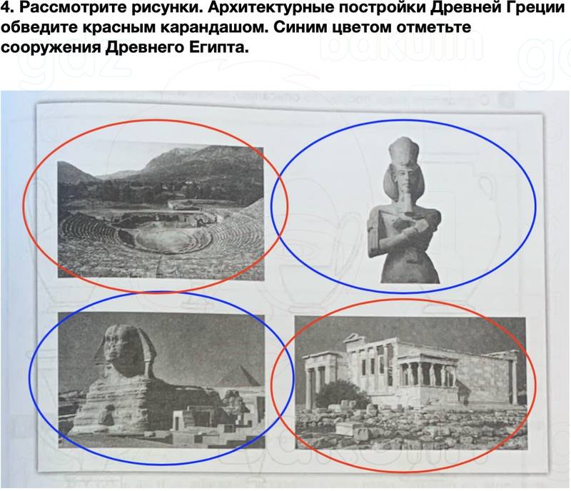4. Рассмотрите рисунки. Архитектурные постройки Древней Греции обведите красным карандашом. Синим цветом отметьте сооружения Древнего Египта.