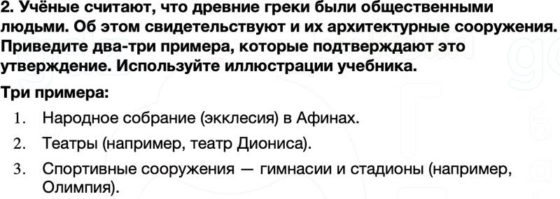 2. Учёные считают, что древние греки были общественными людьми. Об этом свидетельствуют и их архитектурные сооружения. Приведите два-три примера, которые подтверждают это утверждение. Используйте иллюстрации учебника.
