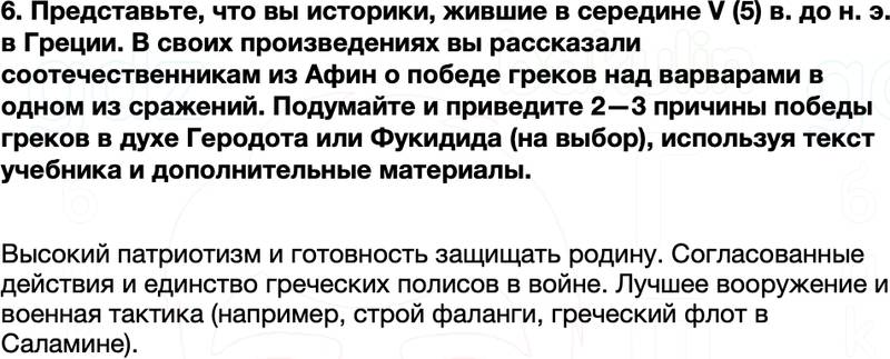 6. Представьте, что вы историки, жившие в середине V (5) в. до н. э. в Греции. В своих произведениях вы рассказали соотечественникам из Афин о победе греков над варварами в одном из сражений. Подумайте и приведите 2—3 причины победы греков в духе Геродота или Фукидида (на выбор), используя текст учебника и дополнительные материалы.