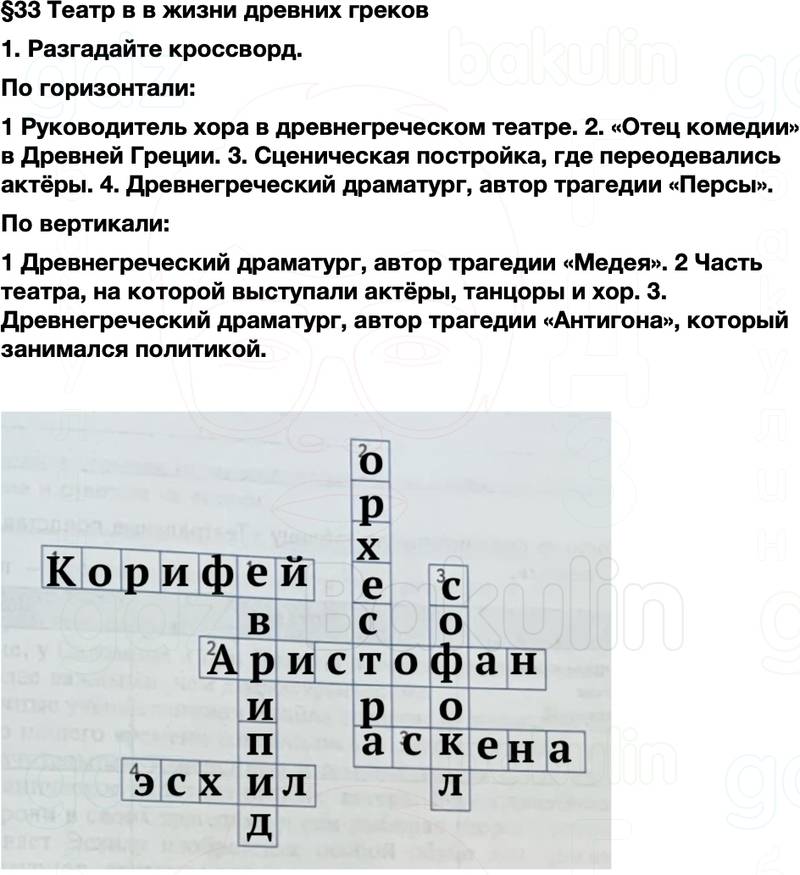 1 Руководитель хора в древнегреческом театре. 2. «Отец комедии» в Древней Греции. 3. Сценическая постройка, где переодевались актёры. 4. Древнегреческий драматург, автор трагедии «Персы».